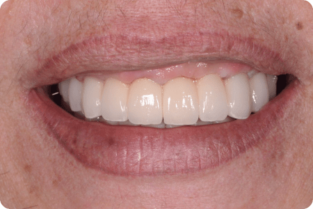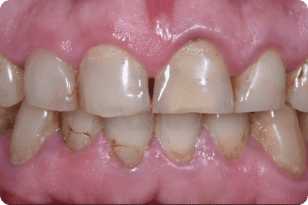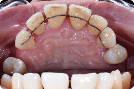 Пациент обратился с агрессивной формой пародонтита с целью сохранить свои собственные зубы. Симптомы — подвижность зубов, гноетечение, воспаление десен. Проведено шинирование зубов и лоскутная операция во всех сегментах с целью стабилизации пародонтита. Результат спустя год.