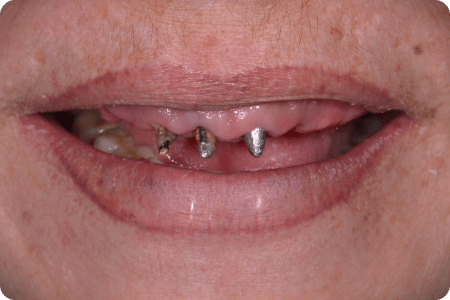 Пациентка обратилась в клинику с разрушенными зубами. Проведена тотальная реабилитация на четырех имплантатах.