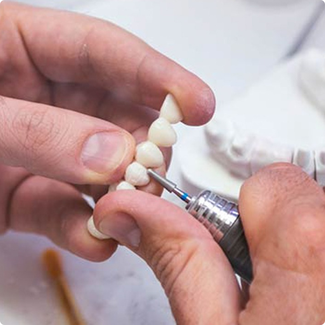 В случае изготовления протеза из металла или диоксида циркония с покрытием из керамики техник наносит эстетический слой на каркас вручную, воссоздавая оттенки натуральной эмали.