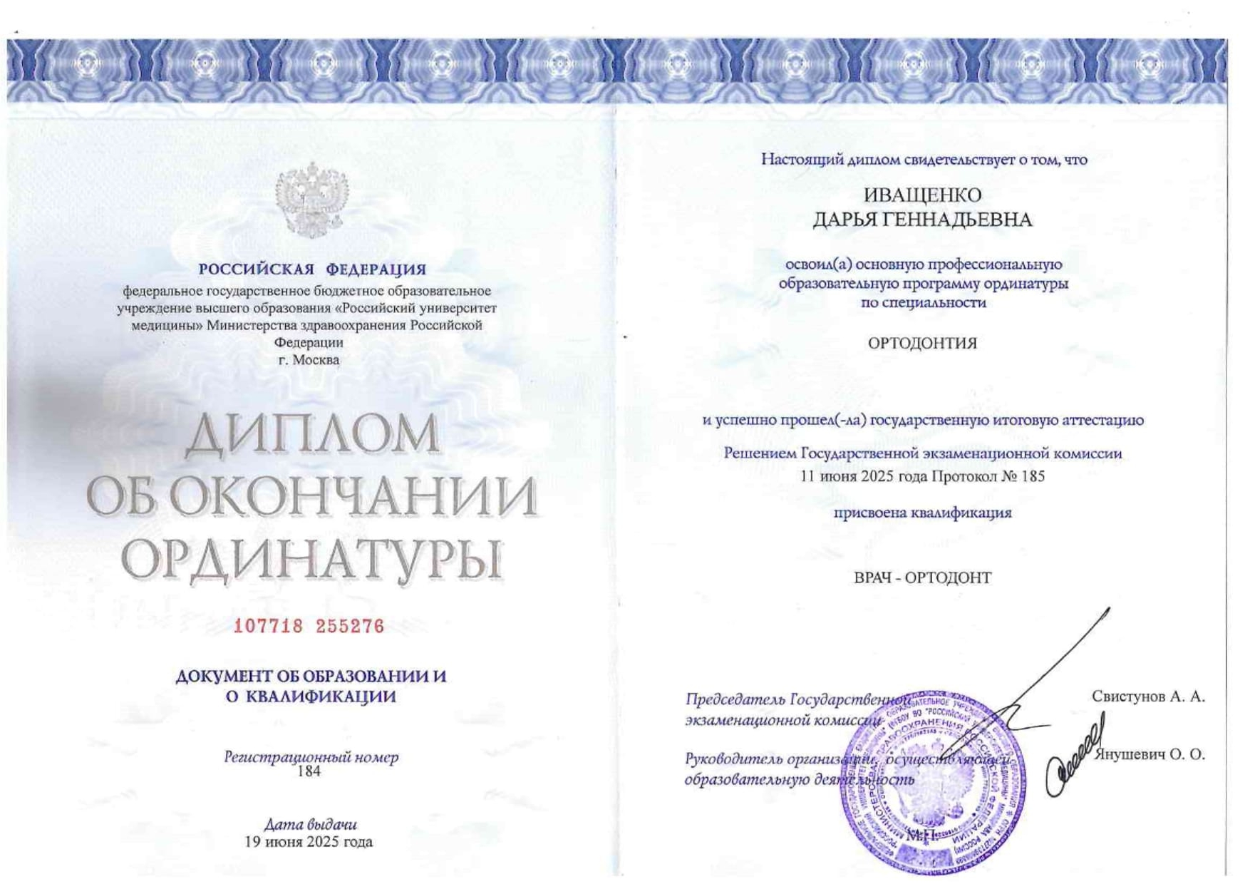 - Ординатура: Российский университет медицины Минздрава России / Стоматология ортодонтическая, 2025 г.