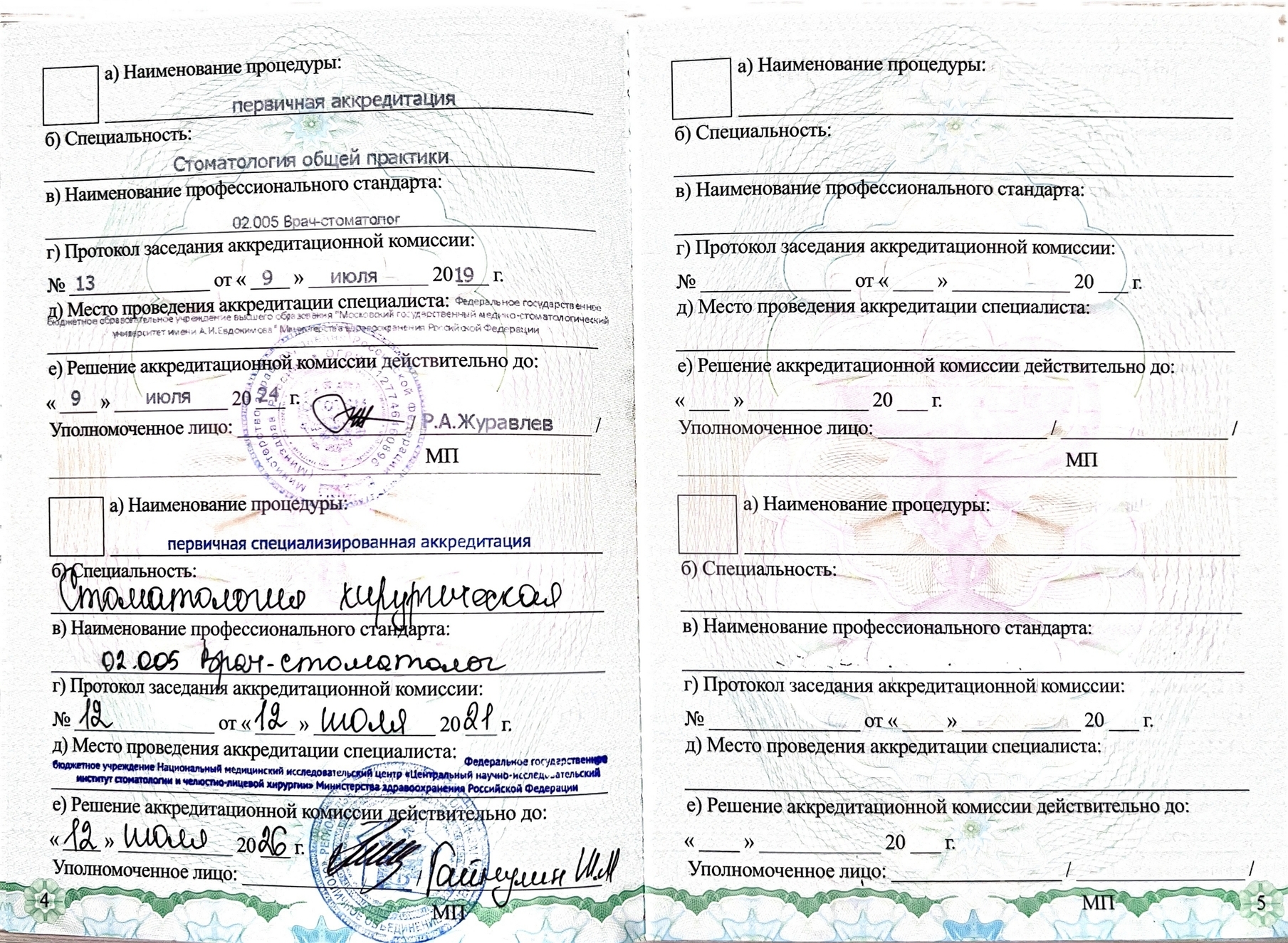 - Интернатура: НМИЦ Центральный научно-исследовательский институт стоматологии и челюстно-лицевой хирургии / «Стоматология хирургическая», 2021 г.