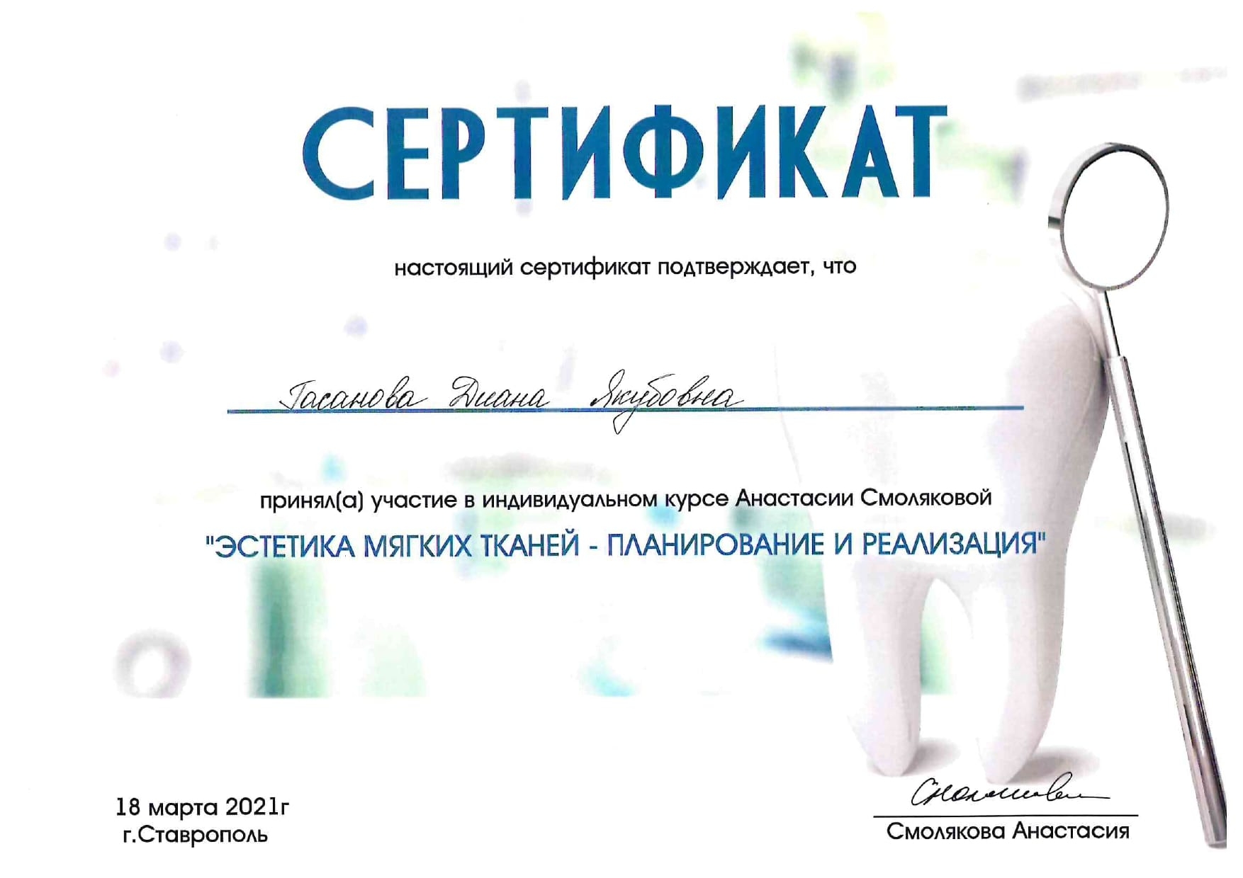 - Анастасия Смолякова. «Эстетика мягких тканей-планирование и реализация», 2021 г.