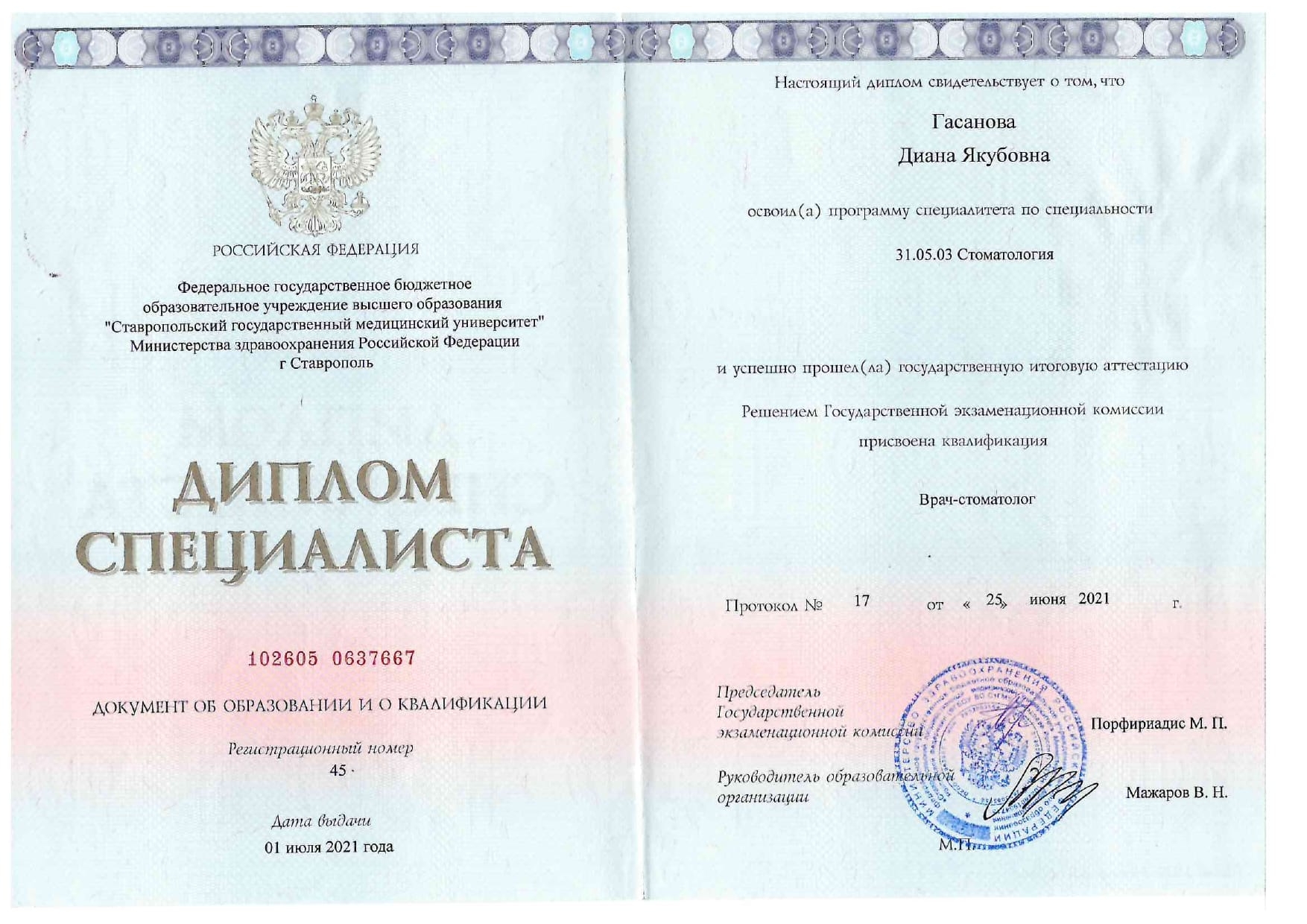 - Ставропольский государственный медицинский университет / Стоматолог-терапевт, 2021 г.