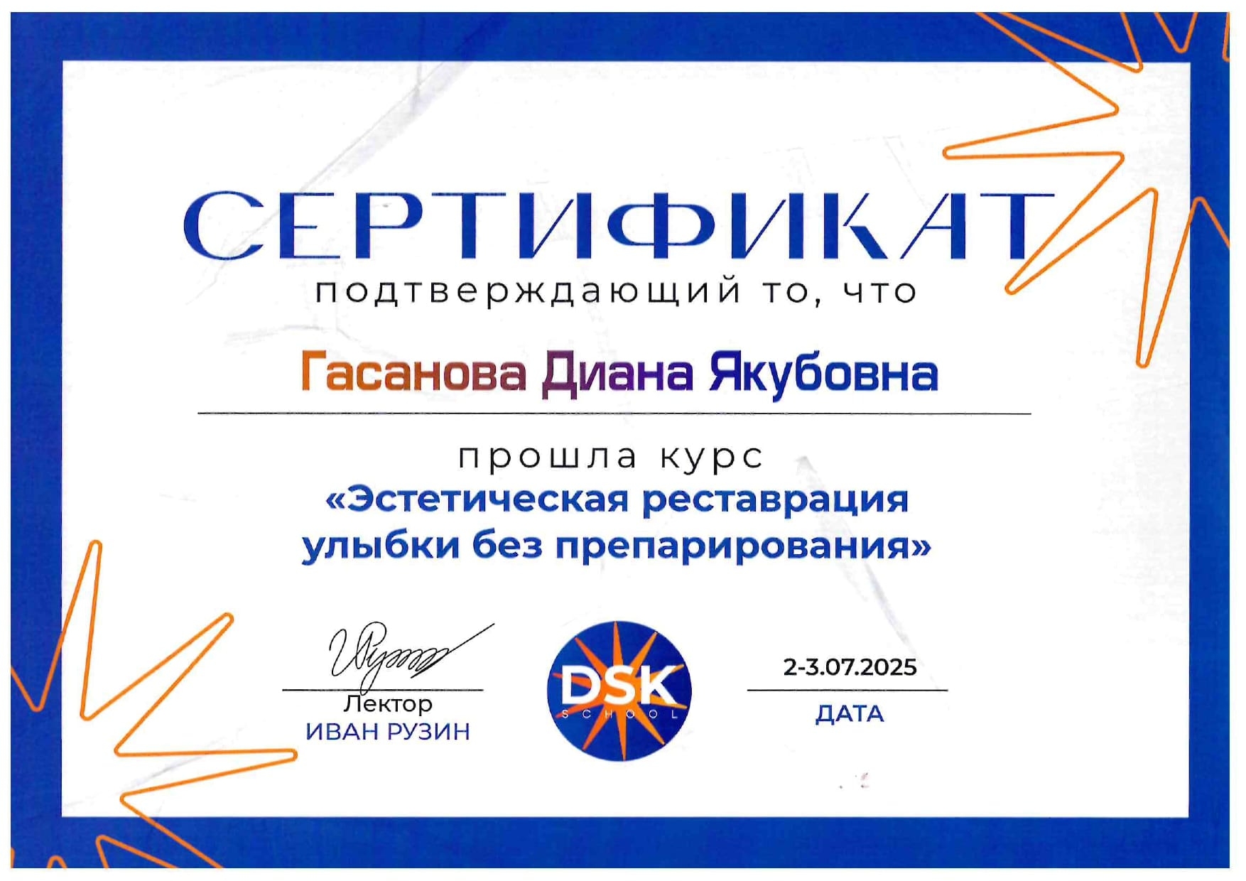 - Dentsply Sirona Academy. Лекционно-практический курс: «Системный подход для успешной реставрации фронтальной группы зубов», 2023 г.