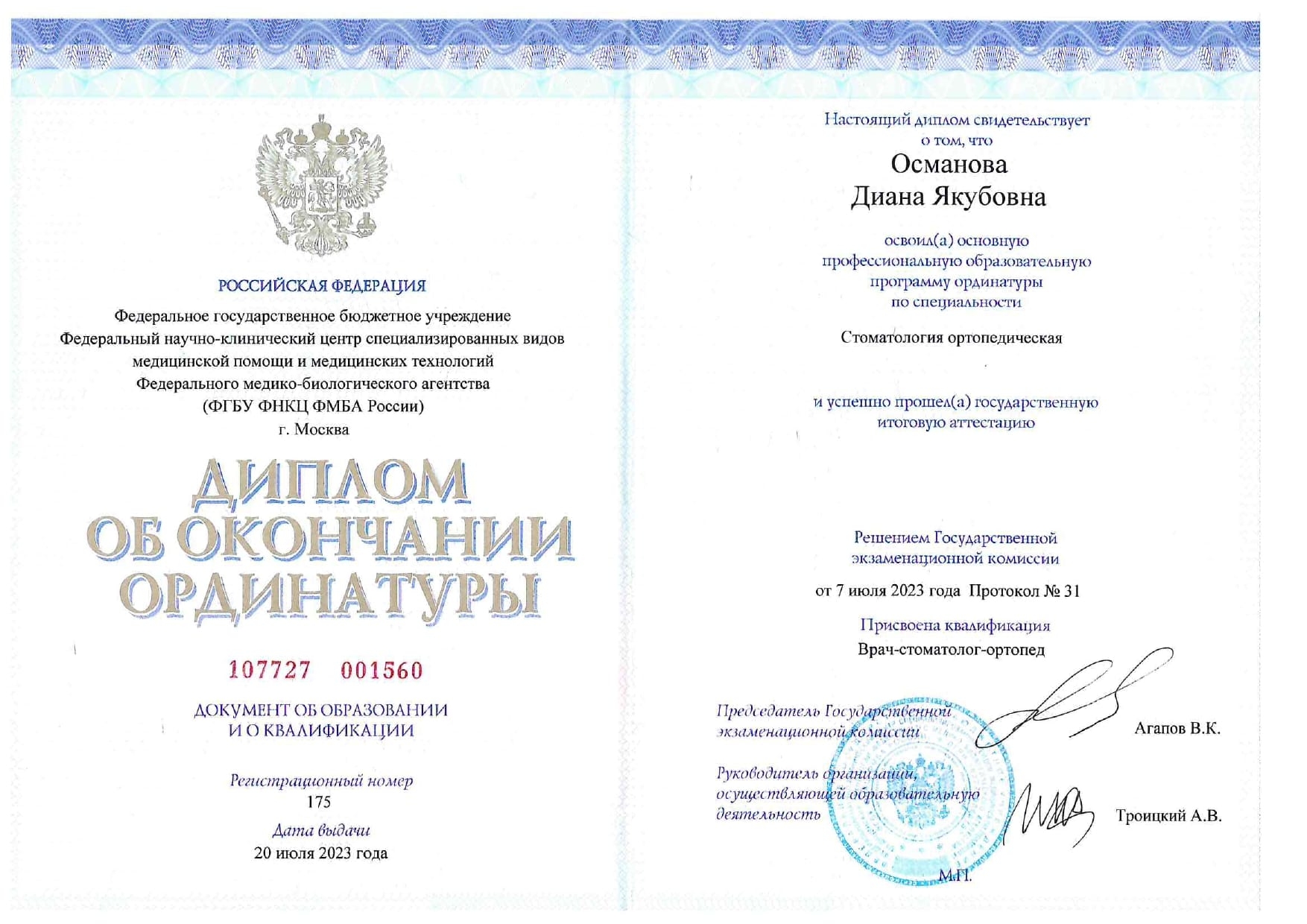 - Ординатура: ФГБУ ФНКЦ ФМБА России / Стоматолог-ортопед, 2023 г.