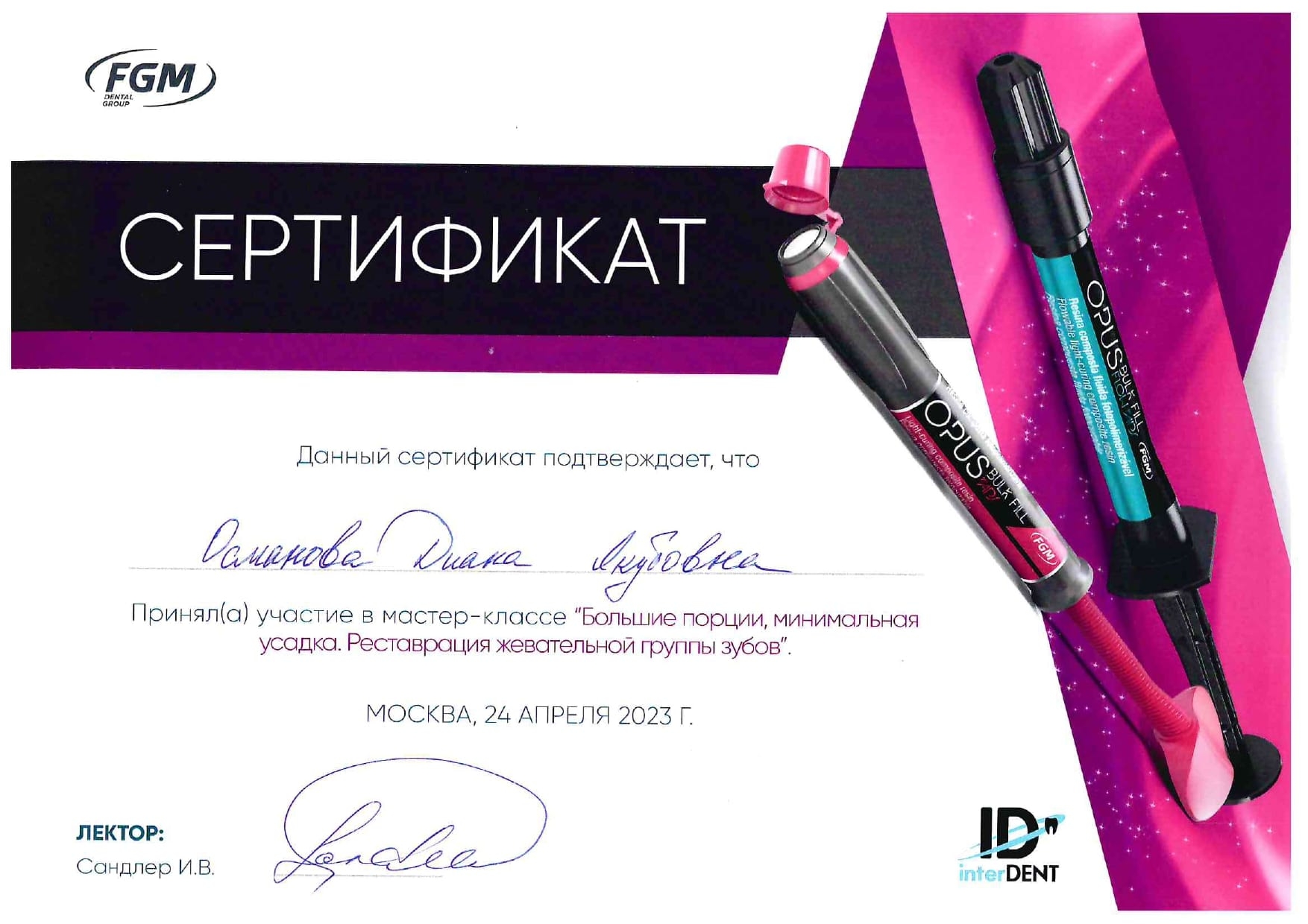 - Sandler.I.V. FGM. Мастер-Класс «Большие порции, минимальная усадка. Реставрация жевательной группы зубов.», 2023 г.
