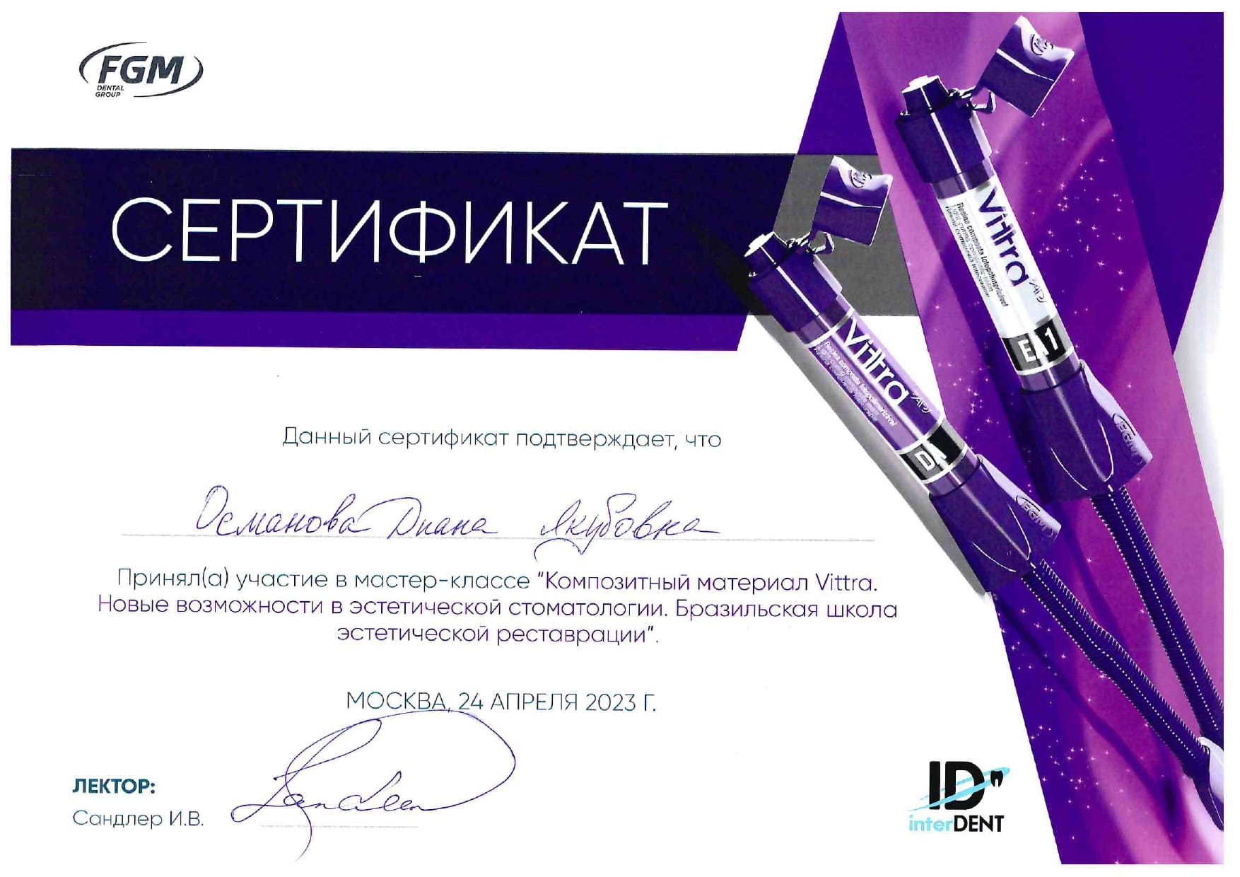 - Sandler.I.V. FGM. Мастер-класс «Композитный материал Vittra. Новые возможности в эстетической стоматологии. Бразильская школа эстетической реставрации», 2023 г.