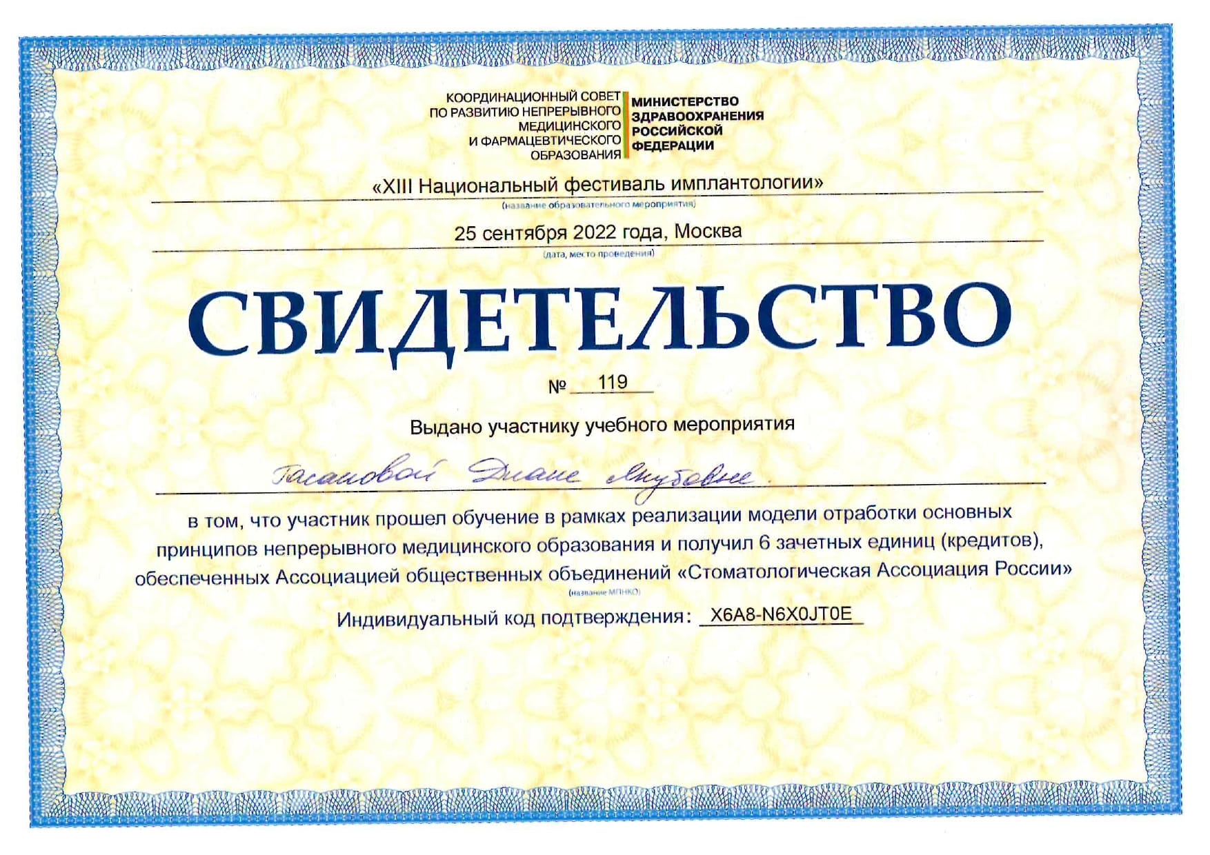- Координационный совет по развитию непрерывного медицинского и фармацевтического образования. Министерство Здравоохранения РФ. Курс непрерывного медицинского образования «Стоматологическая Ассоциация России». «XII Национальный фестиваль имплантологии», 2022 г.