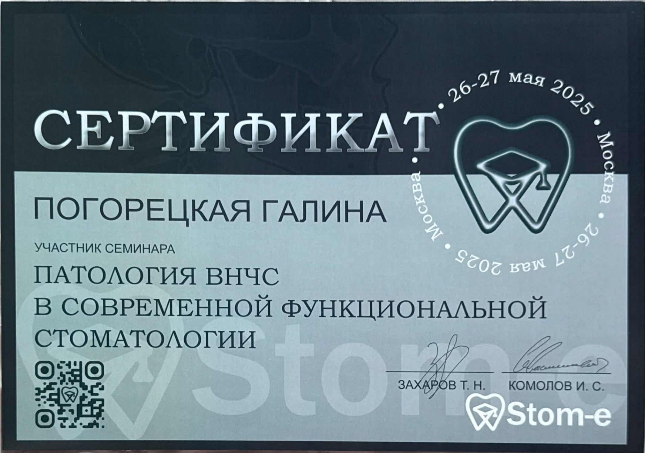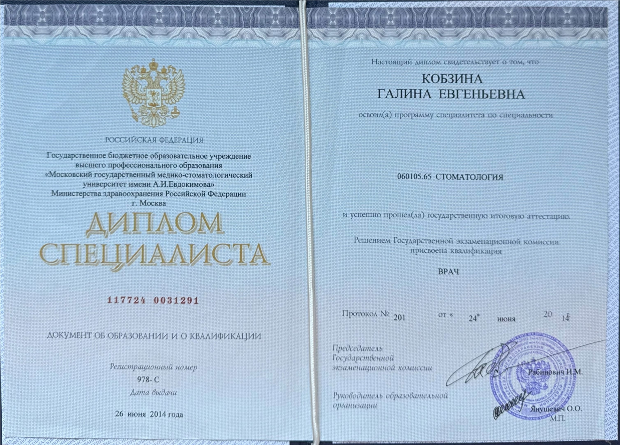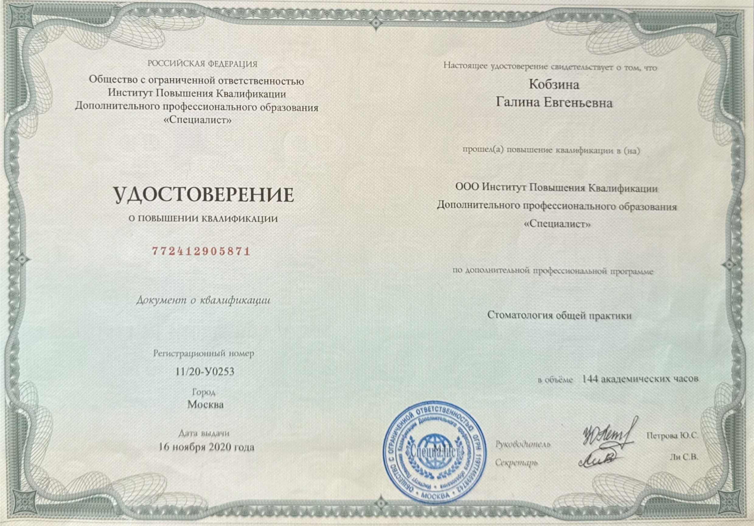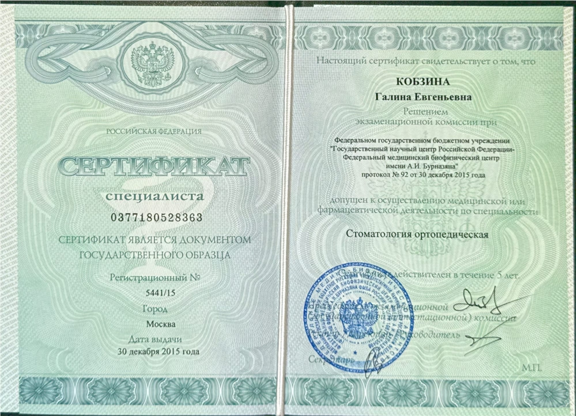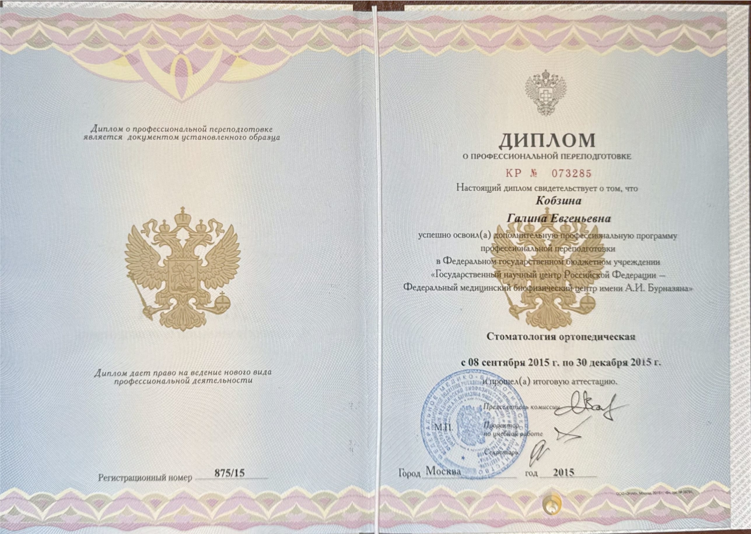 - Профессиональная переподготовка: ФГБУ «Государственный научный центр РФ Федеральный медицинский биофизический центр имени А.И. Бурназяна» / Ортопедическая стоматология, 2015 г.