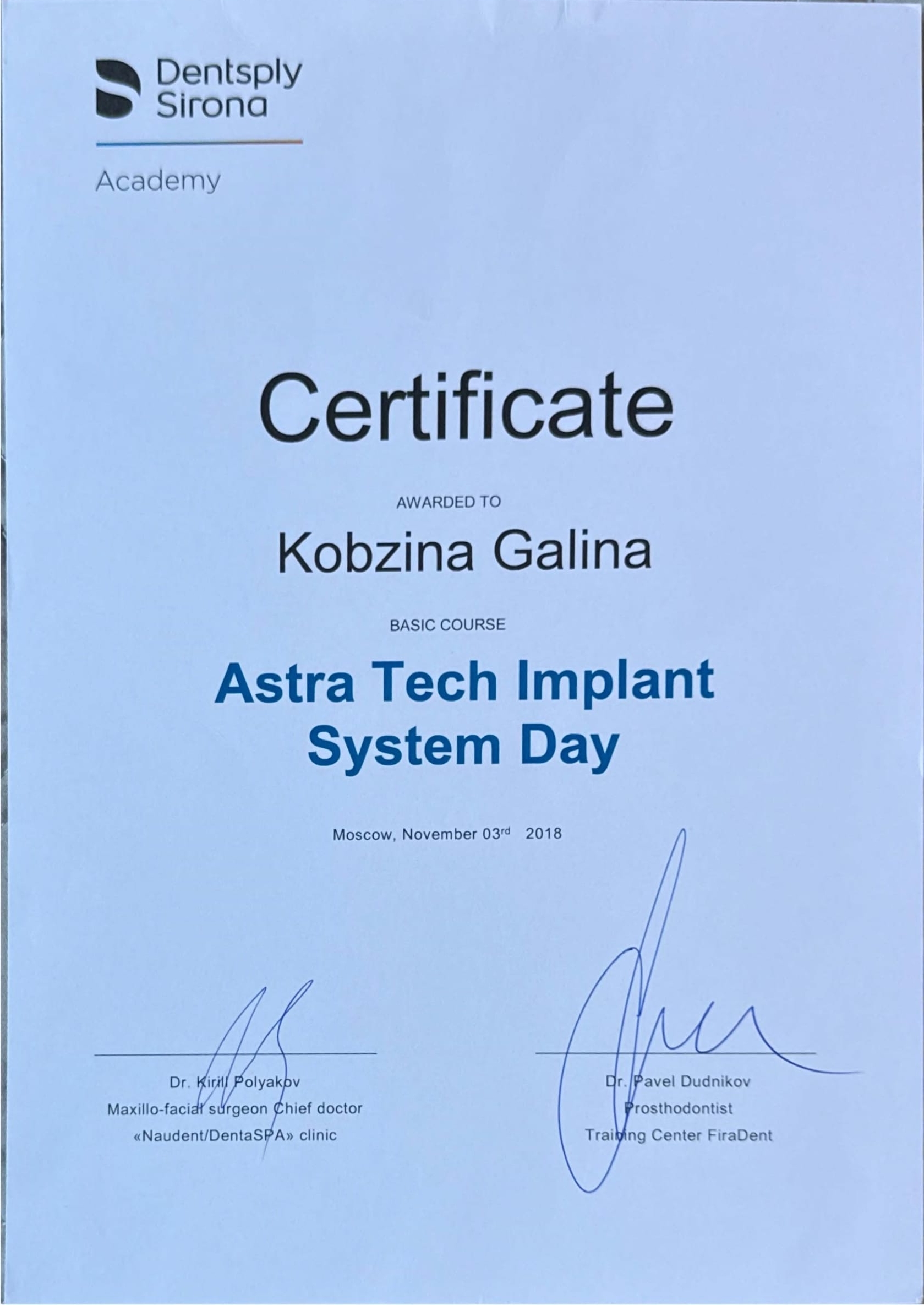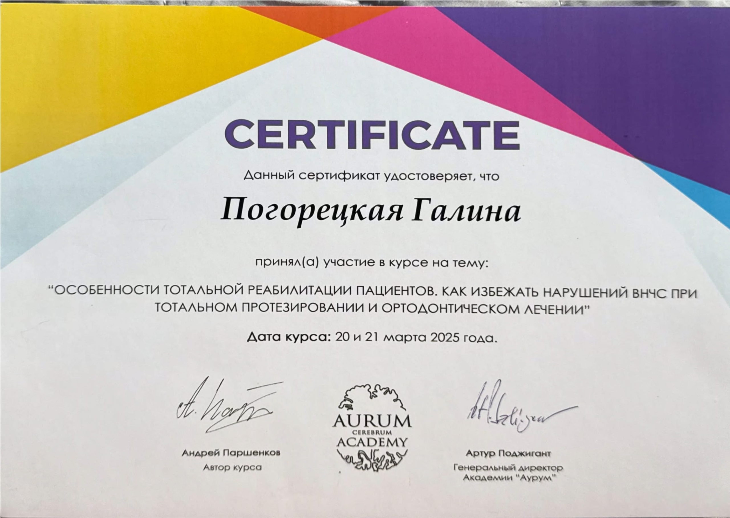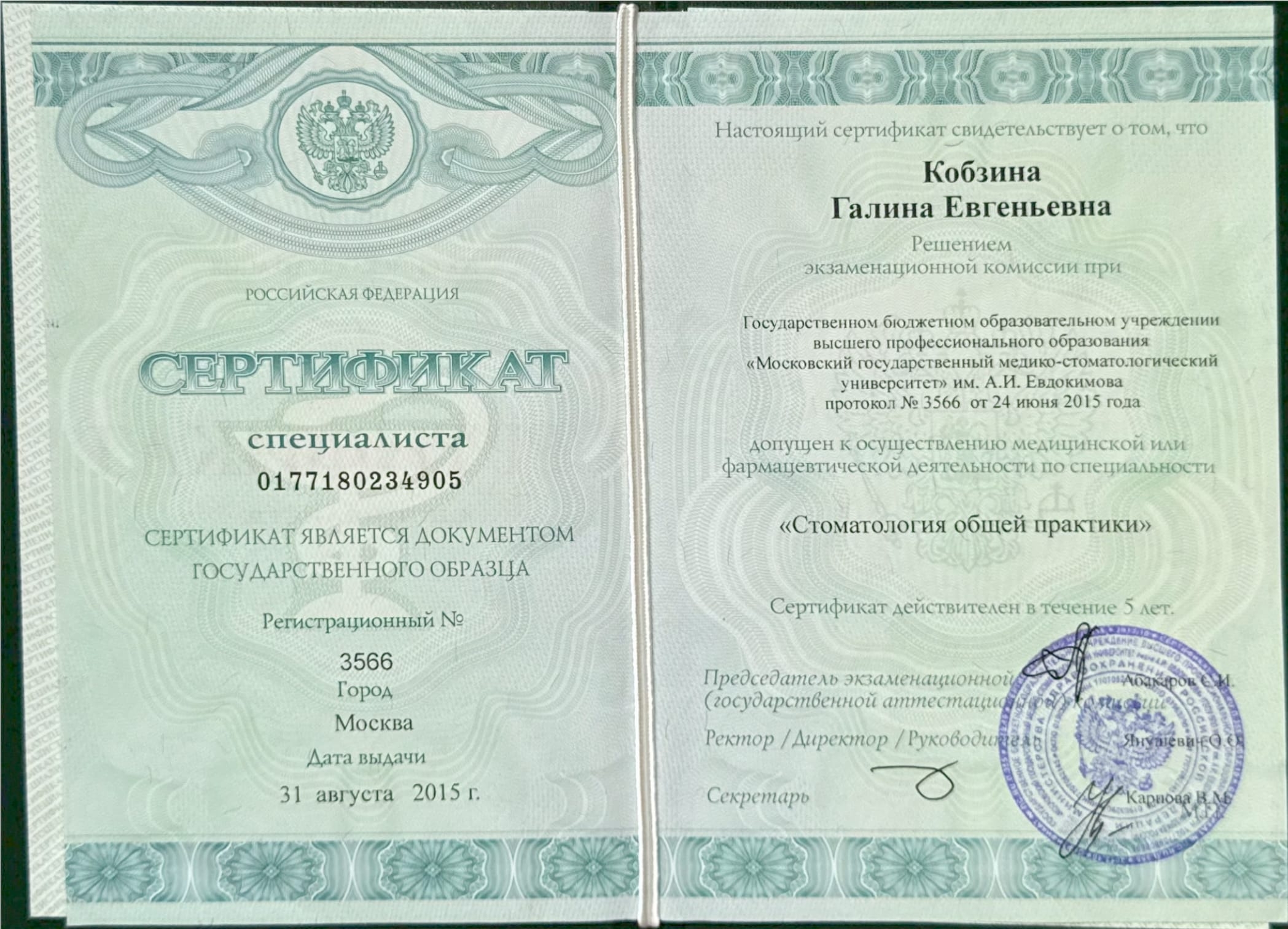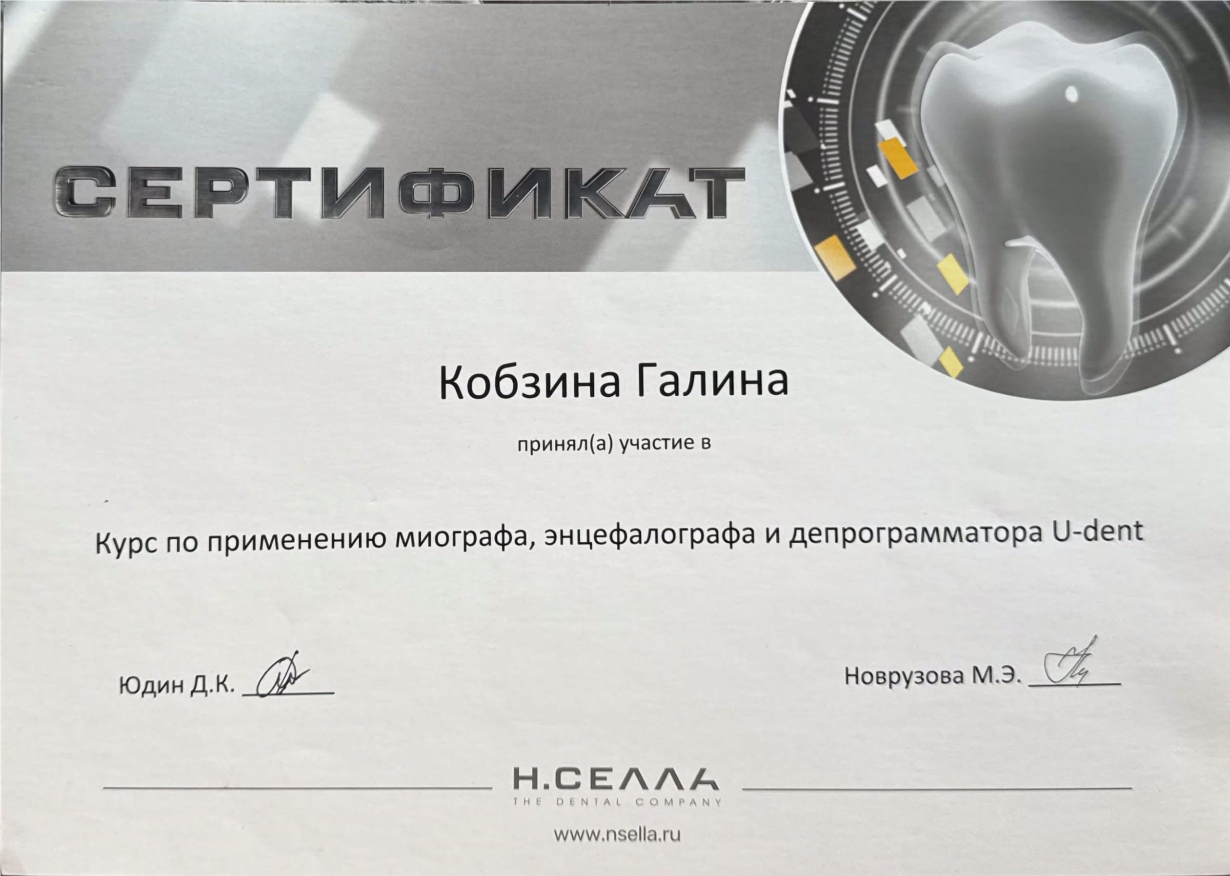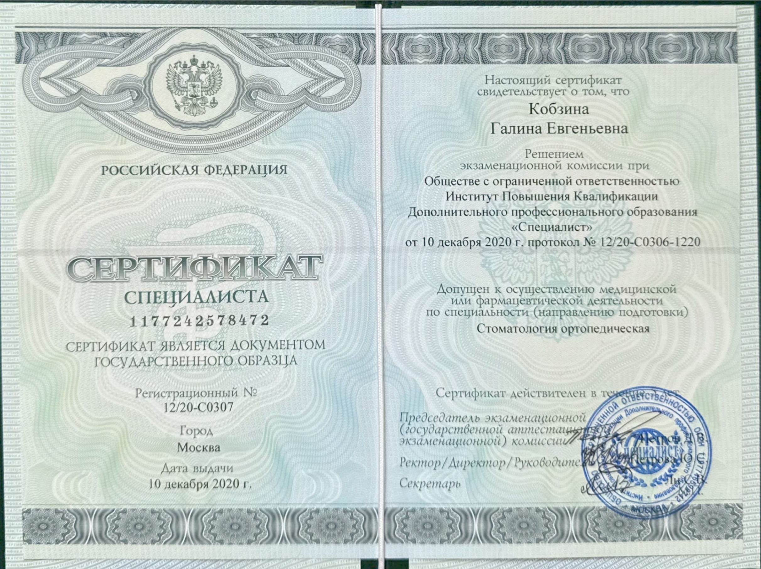 - Профессиональная переподготовка: ФГБУ «Государственный научный центр РФ Федеральный медицинский биофизический центр имени А.И. Бурназяна» / Ортопедическая стоматология, 2015 г.