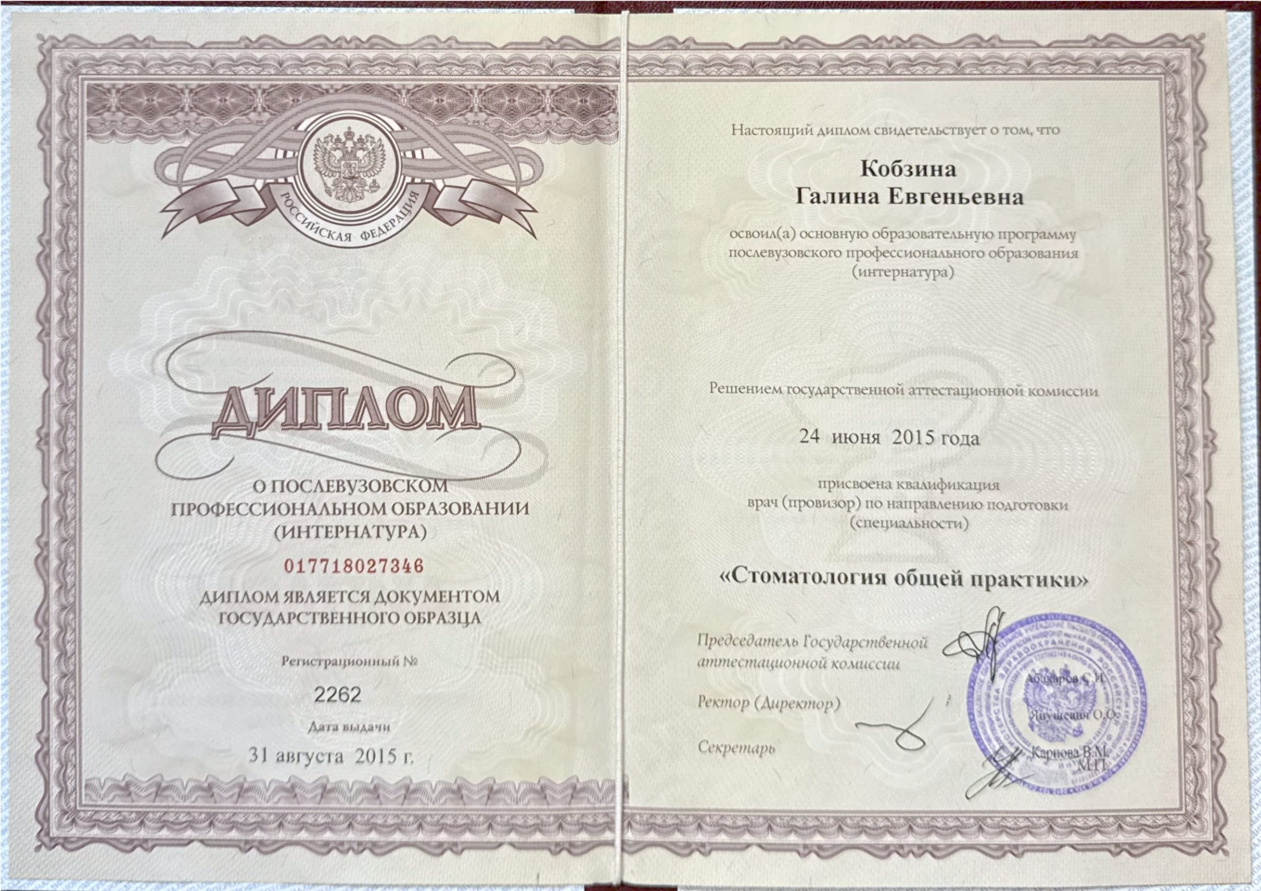 - Интернатура: МГМСУ им. А. И. Евдокимова, Научно-исследовательский медико-стоматологический институт / Стоматология ортопедическая, 2015 г.