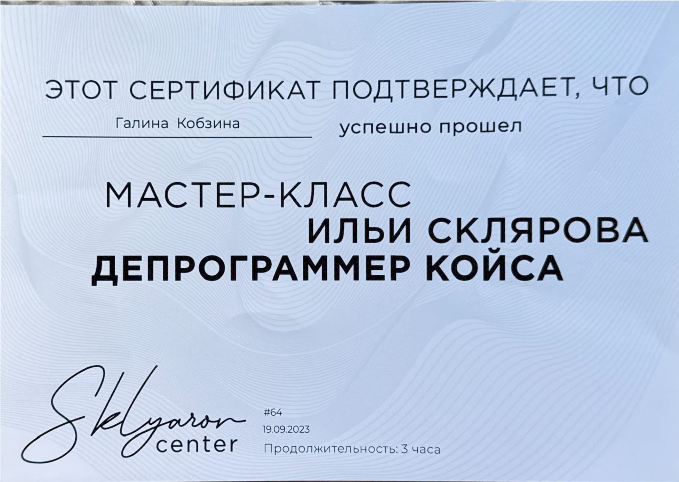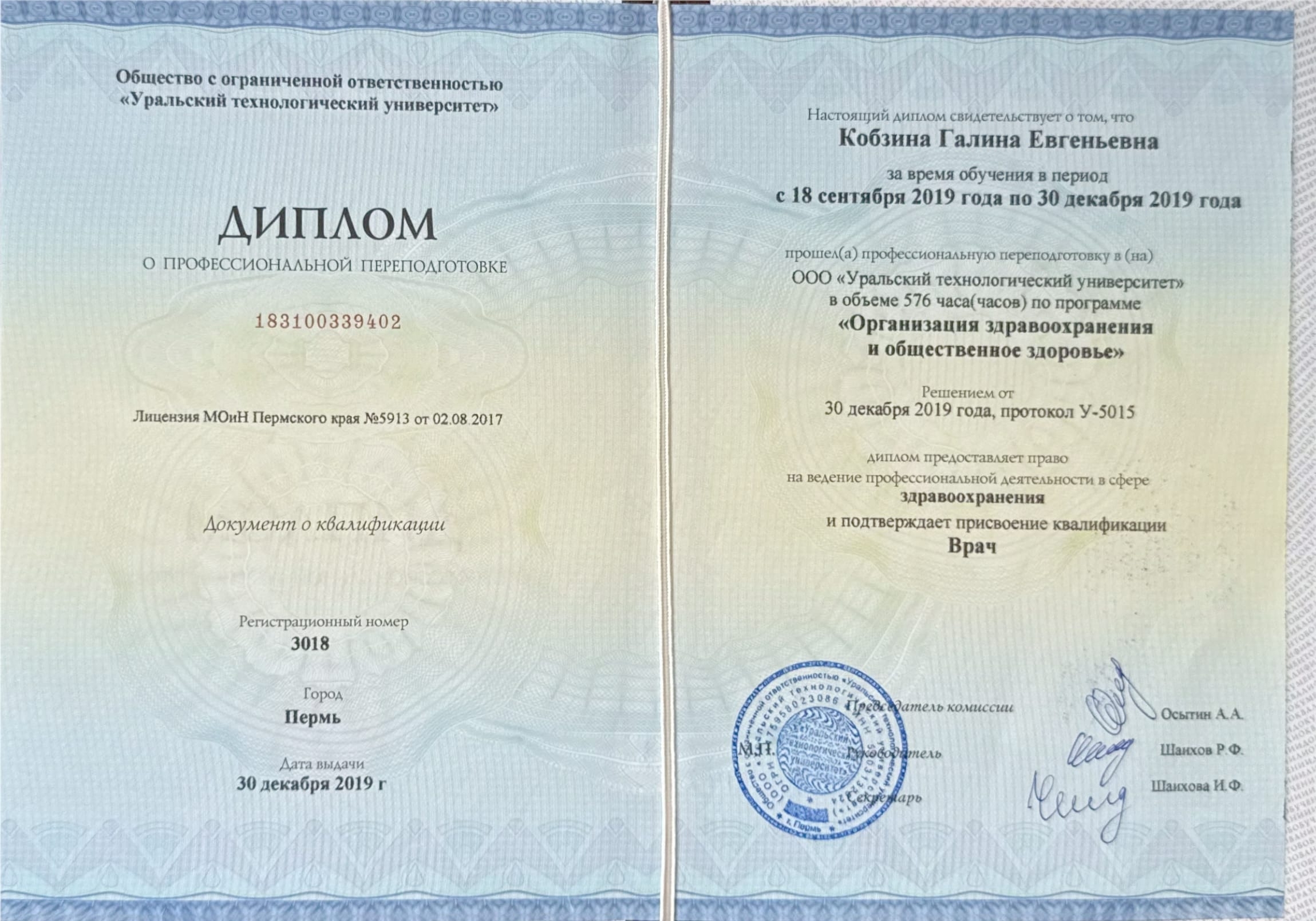 - Профессиональная переподготовка: Уральский технологический университет / Организация здравоохранения, 2019 г.