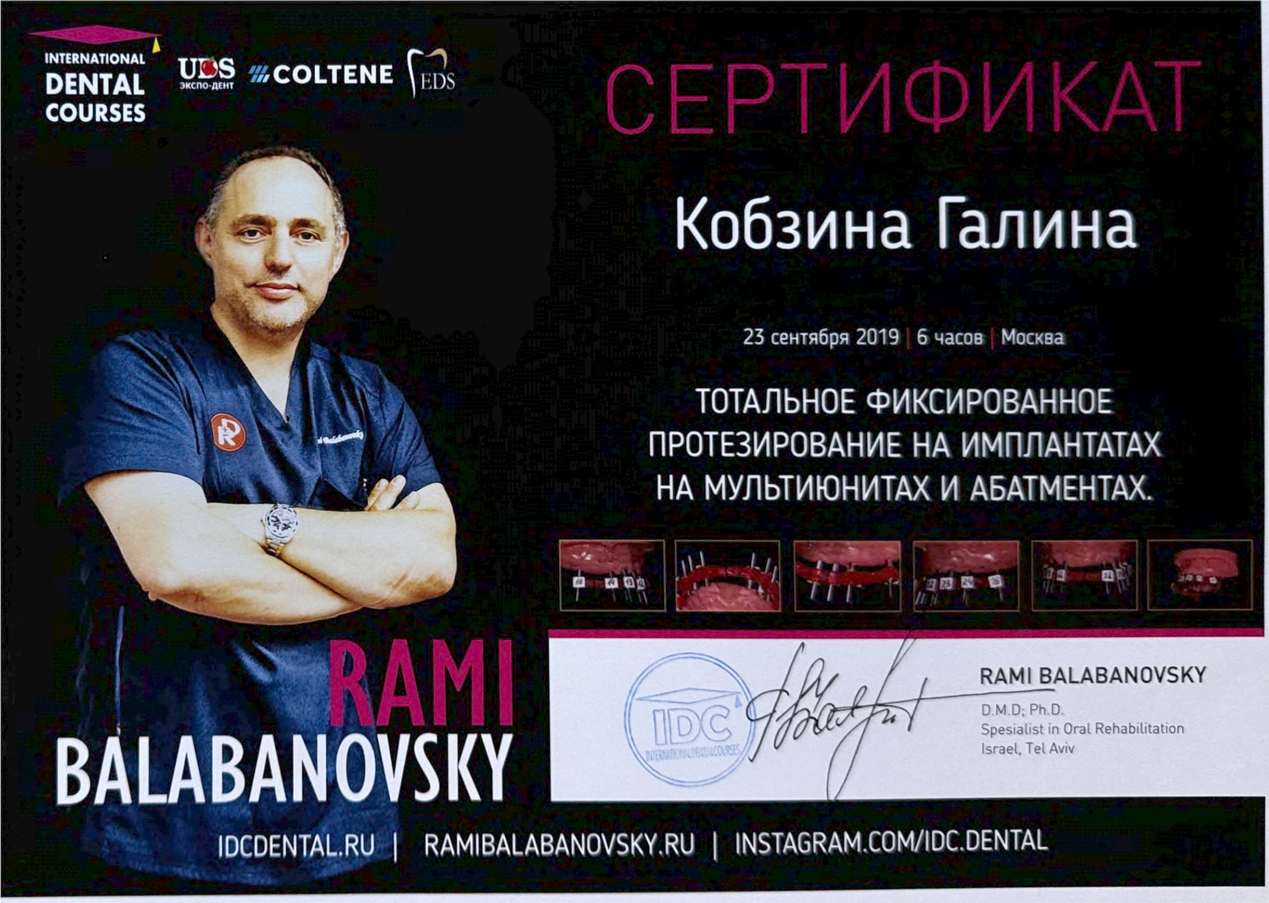 - Rami Balabanovsky. International Dental Courses. Тотальное фиксированное протезирование на имплантатах и мультиюнитах, 2019 г.