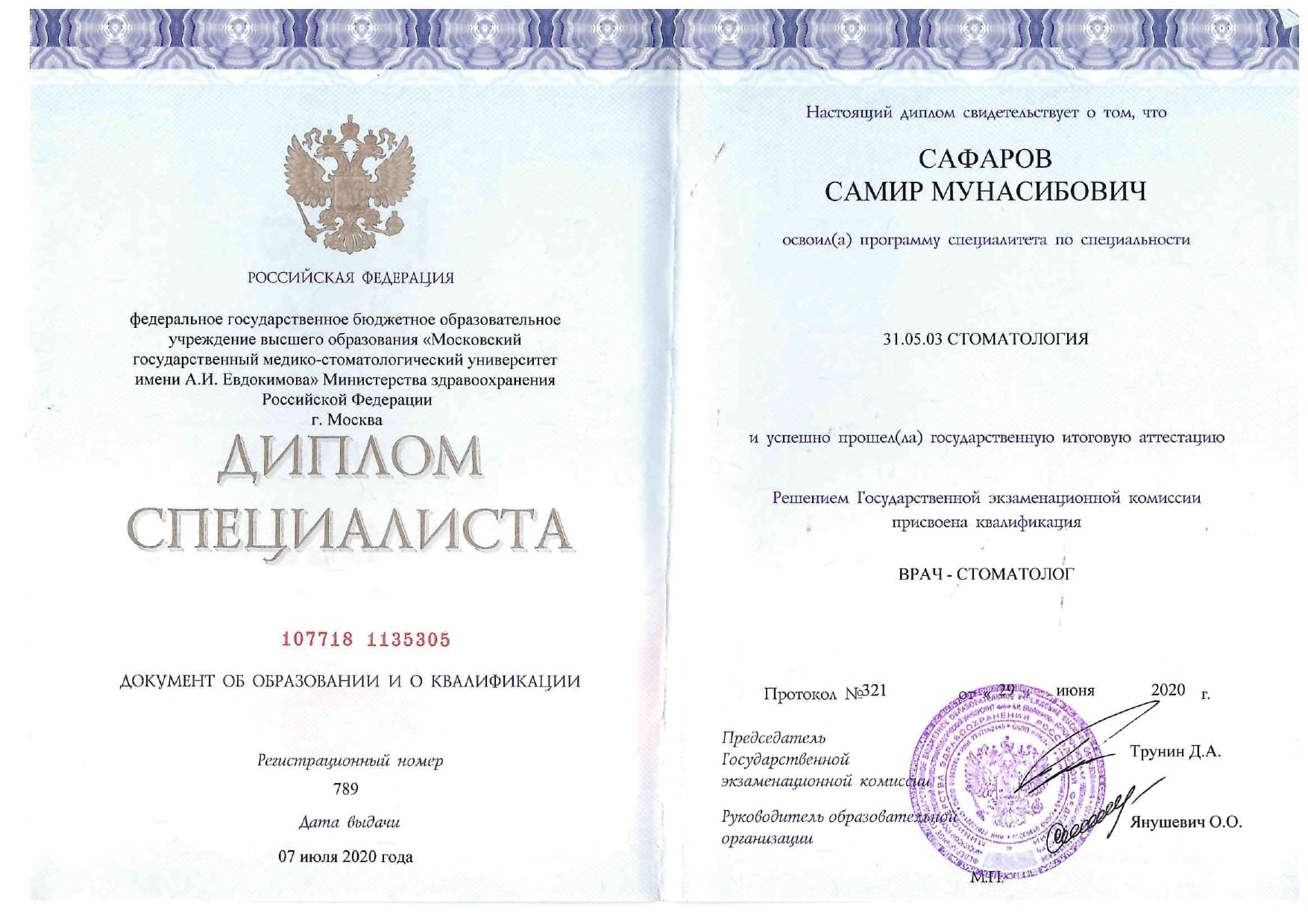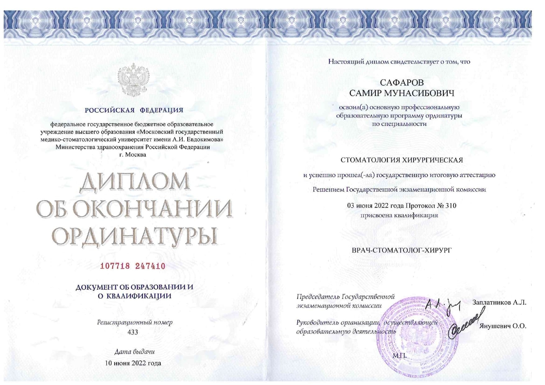 - Ординатура: МГМСУ им. А.И. Евдокимова / Стоматология хирургическая, 2022 г.